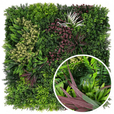 Ce Mur Végétal Synthétique OASIS Rebgreen est un Mélange de buis et de fougères dans des tons vert et pourpre. Il est conditionné sous forme de plaques au format carré de 1mx1m et livré avec attaches intégrées. Il sera idéal pour créer des ambiances naturelles sur les clôtures, murs et murets intérieurs ou extérieurs, et préserver votre espace privé.